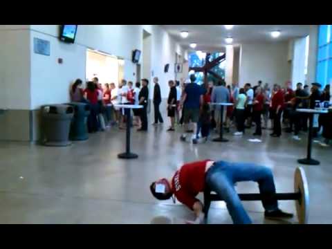 El mundo cada vez mas esta al revez!! miren a este hombre que intenta saltar y pararse sobre una mesa .. [et]